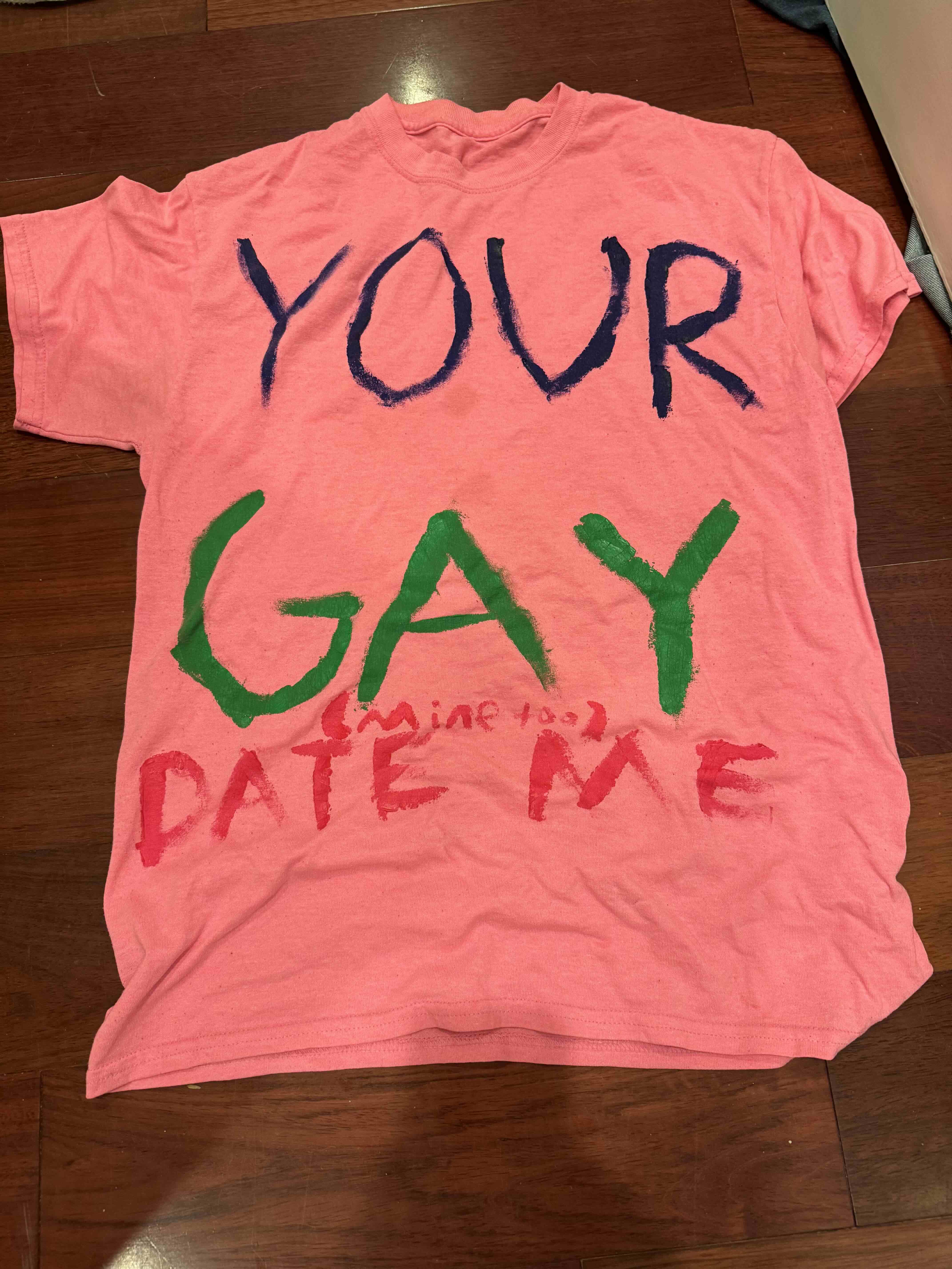 There is a theme I like very much, of pretending not to understand something and making a stupid point that is in actuality a joke that other people don't understand. Now that I say it like this I suppose that's cruel. In this case the joke is that it says "Your Gay", which leads people to believe I'm retarded because I'm making a peurile joke and misspelling it, but then in harder to see letters it says "mine too, date me", which i think is amusing. I also like that it looks retarded because of my poor writing. Shockingly I painted this 6 years ago and there's been ~no damage since that time.